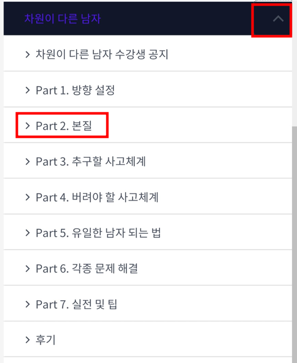 만약 강의가 보이지 않는다면 새로고침 또는 로그아웃 후 다시 로그인을 하시고 차원이 다른 남자 메뉴 오른쪽에 꺽쇠를 클릭해